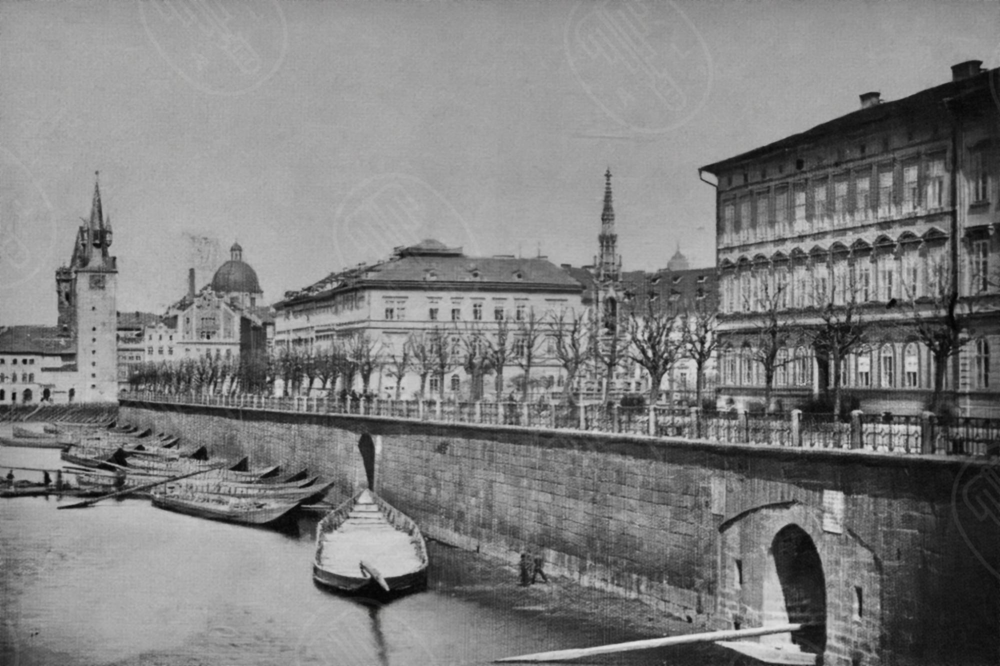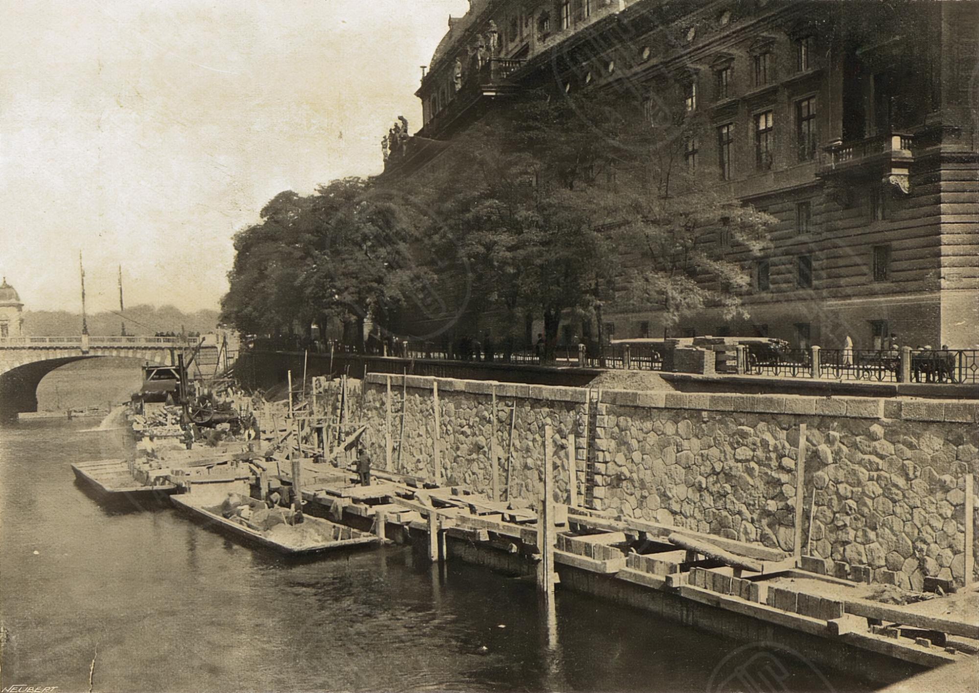 Výstavba prvního moderního pražského nábřeží na přelomu 30. a 40. let 19. století se přímo pojila se stavbou řetězového mostu císaře Františka I. (dnešní most Legií), jejichž hlavním dodavatelem byla firma Lanna. Počátek nového nábřeží stavebně vázal na předmostí, sahající až po lávku na Slovanský ostrov (Žofín) a pokračoval dále po proudu ke Staroměstským mlýnům. Autorem projektu a urbanistického konceptu byl německý architekt Bernard Grueber (1807–1882).