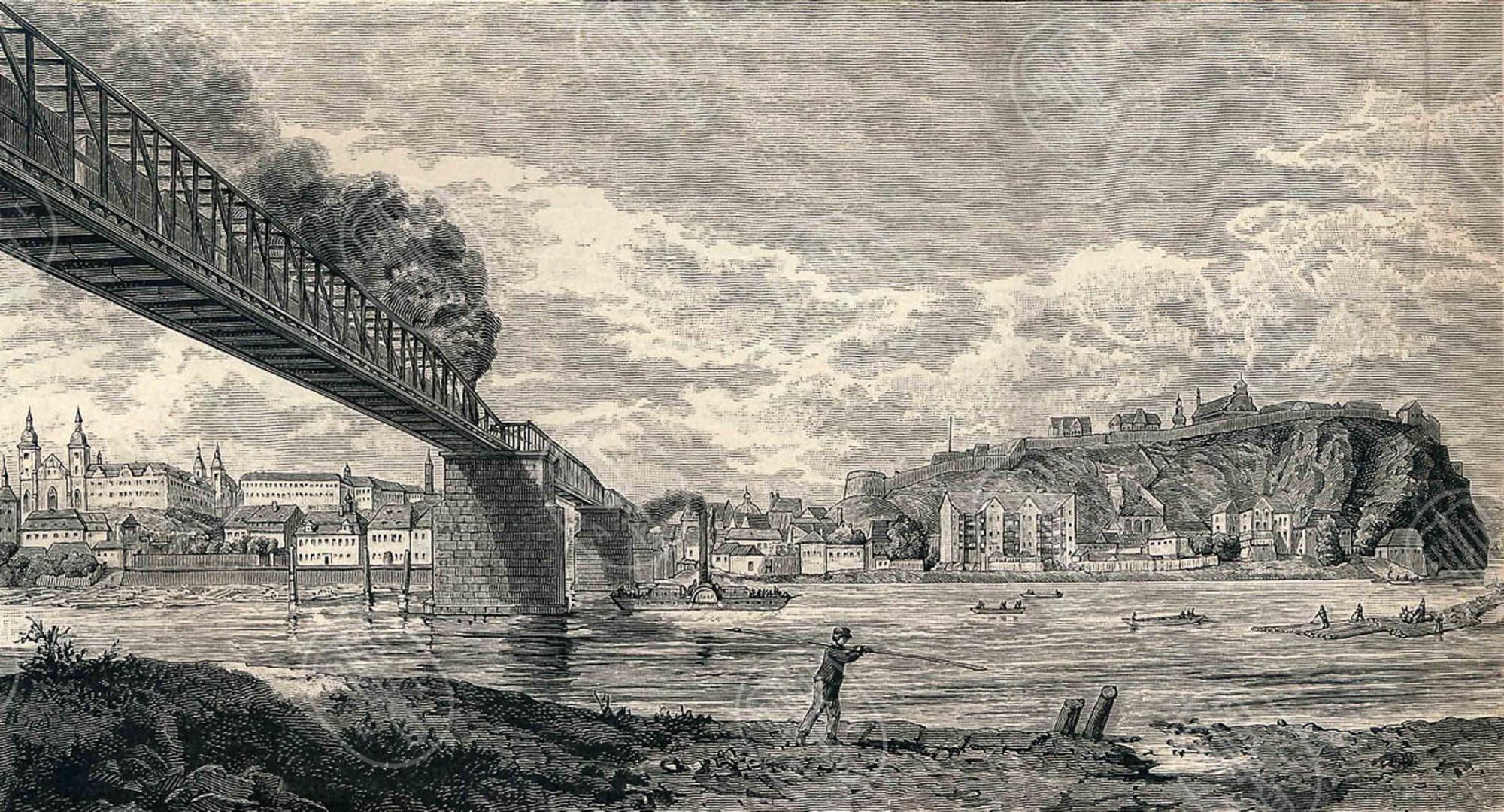 Most byl postaven v letech 1871–1872 jako součást tzv. Pražské spojovací dráhy, která byla podmínkou koncese udělené 1866 společnosti Dráhy císaře Františka Josefa (KFJB) a umožňovala nákladní dopravu (osobní až od roku 1888) z žižkovské Hrabovky u Nádraží státní dráhy – dnes Masarykova nádraží přes dnešní Hlavní nádraží do stanice České západní dráhy na Smíchově. Stavbu trati, která umožnila propojit dráhy všech společností, jejichž tratě do Prahy ústily, realizovalo Stavební podnikatelství Dráhy císaře Františka Josefa reprezentovanépředevším firmami Lanna a Bratři Kleinové. Kromě vedení trati u dnešního Hlavního nádraží tunelem bylo klíčovým a složitým dílem překročení Vltavy na Smíchov. . Všechny mosty společnosti byly vybudovány jako provizorní, dřevěné, včetně největšího mostu přes Dunaj u dolnorakouského Tullnu. V Praze tomu bylo jinak: obavy z jarních ledochodů a požadavek na dostatečnou šíři plavební dráhy si vynutily most ocelový – tehdy se říkalo železný. Jednokolejný most s dolní mostovkou o pěti polích z příhradových nosníků lichoběžníkového tvaru byl položen na třech návodních a dvou pobřežních pilířích, na které směrem k Vyšehradu navazoval zděný viadukt. Pilíře byly od počátku projektovány v dostatečné šíři, umožňovaly budoucí osazení druhé koleje. Každé příhradové mostní pole mělo rozpětí 18 sáhů (34 m). Nýtovanou konstrukci vyrobila mostárna Johanna Caspara Harkorta v Duisburgu z belgické svářkové oceli. Zkouška mostu se konala v květnu 1872. Následně bylo nutné za osobní Harkortovy přítomnosti řešit reklamaci: chyběl ochranný nátěr. Kromě mostu přes Vltavu bylo součástí stavby také předmostí na Výtoni. Jednu z konstrukcí pro předmostí dodala Pražská železářská společnost.
